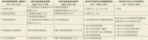 标准是多年来电子档案的标准规范建设和成熟实践的产物。标准与《数字档案馆建设指南》《数字档案室建设指南》《电子文件归档与电子档案管理规范》(GB/T 18894—2016)和《党政机关电子公文归档规范》(GB/T 39362—2020)等一脉相承(见表所示),既在制度建设、系统建设和资源建设等方面延续了相关标准的核心要求,又针对单套管理要求做了适当取舍和调整,便于在已有工作基础上向电子档案单套管理平滑过渡。